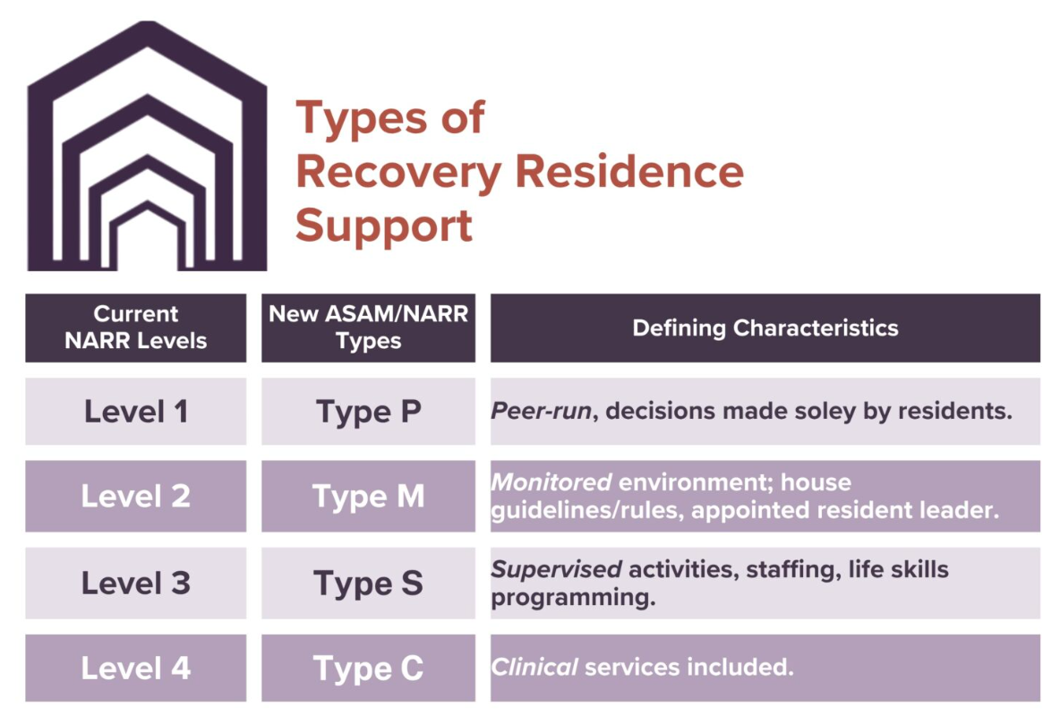 The National Alliance of Recovery Residences (NARR) is one of two accrediting bodies in Montana. This graphic demonstrates the different types of recovery homes that exist.